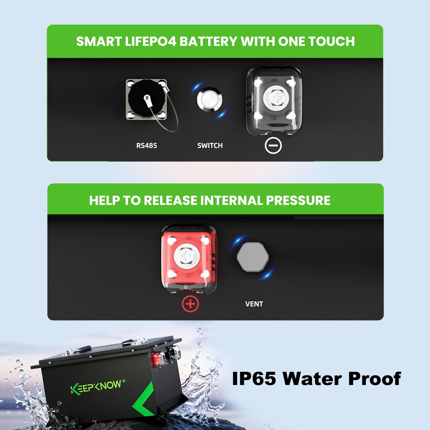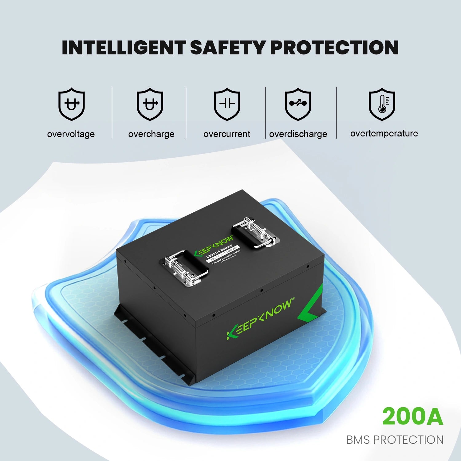 Advanced 200A BMS safeguards the battery from electrical risks and maintains consistent performance with low self-discharge and long lifespan.