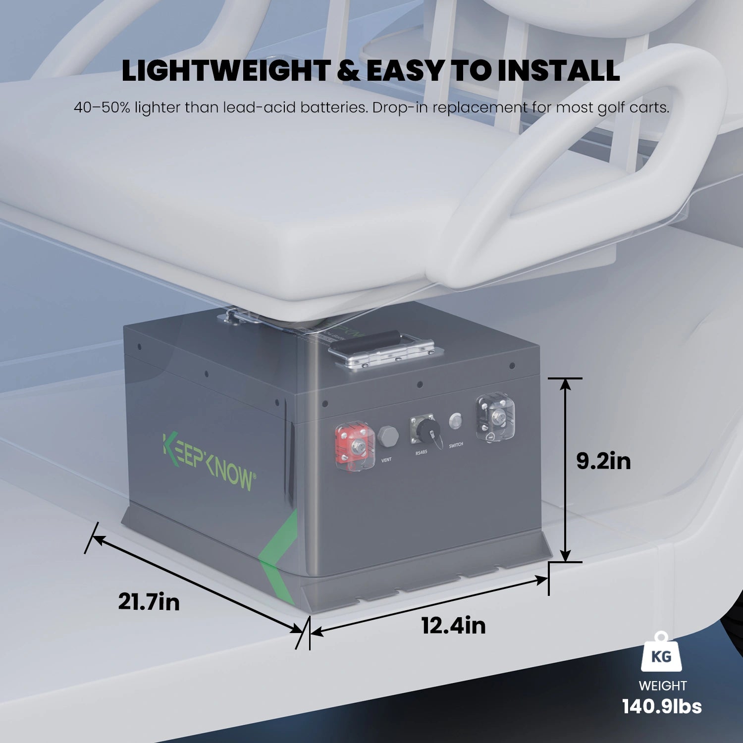 Measuring 21.7×12.4×9.2 inches and weighing just 140.9 lbs, this battery is 40-50% lighter than lead-acid alternatives, yet delivers powerful energy for unmatched performance and reliability.