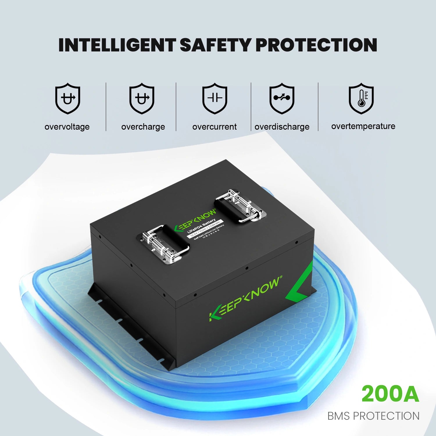 Smart BMS Protection: Equipped with a 200A BMS, this battery safeguards against overcharge, over-discharge, overcurrent, overheating, and short circuits.